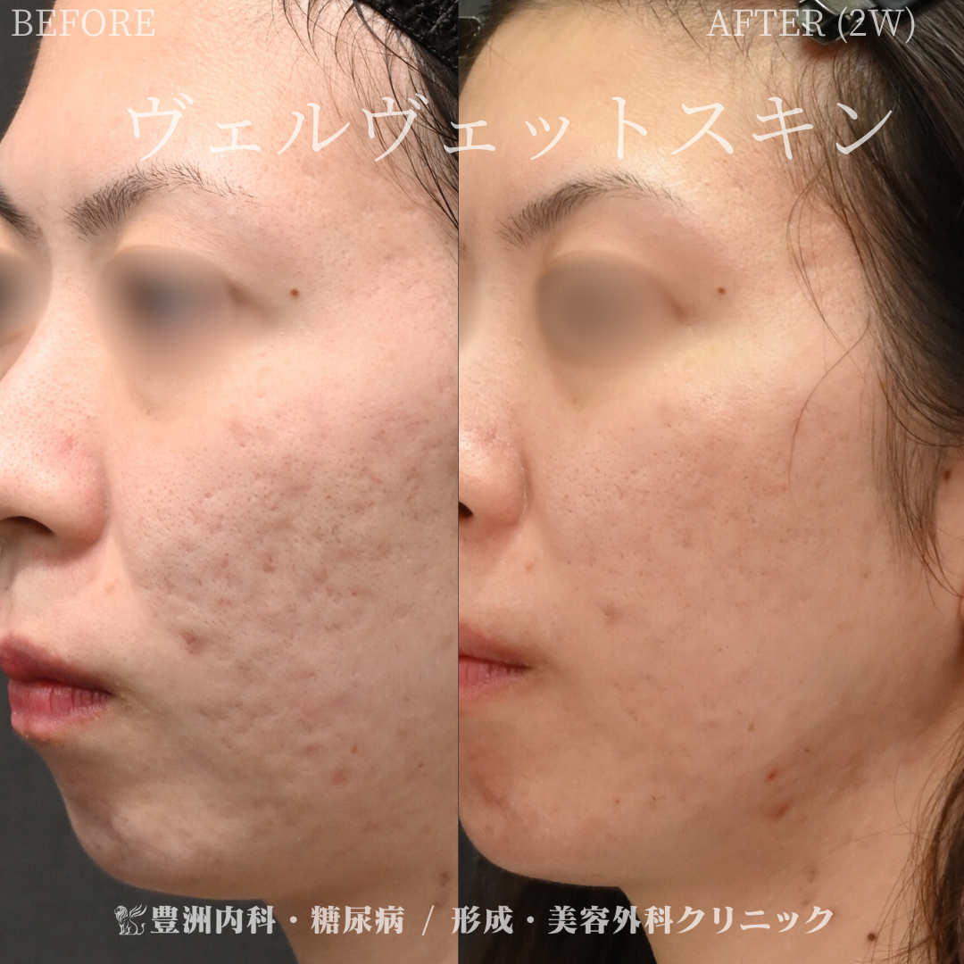 ダーマペンの際にPRX-T33というピーリング剤を併用することで、さらなる相乗効果を発揮します(ヴェルベットスキン)。