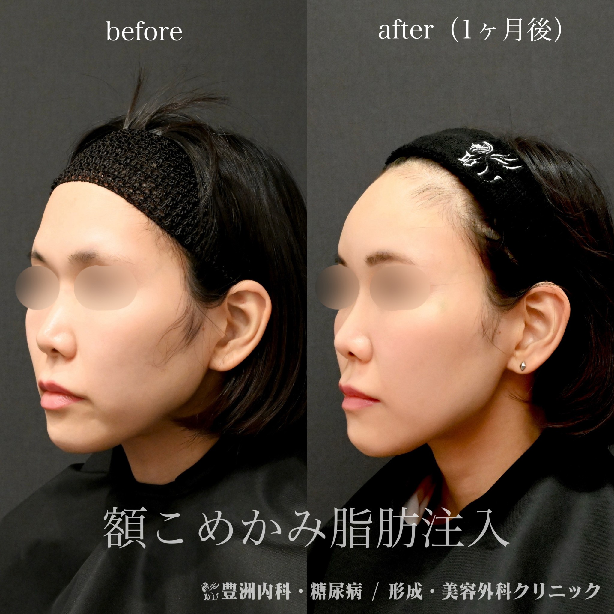 額こめかみに脂肪注入された方の、施術前および施術1ヶ月後の比較写真になります。額の凹付きが消え丸い輪郭になり、見た目の印象も若返っております。