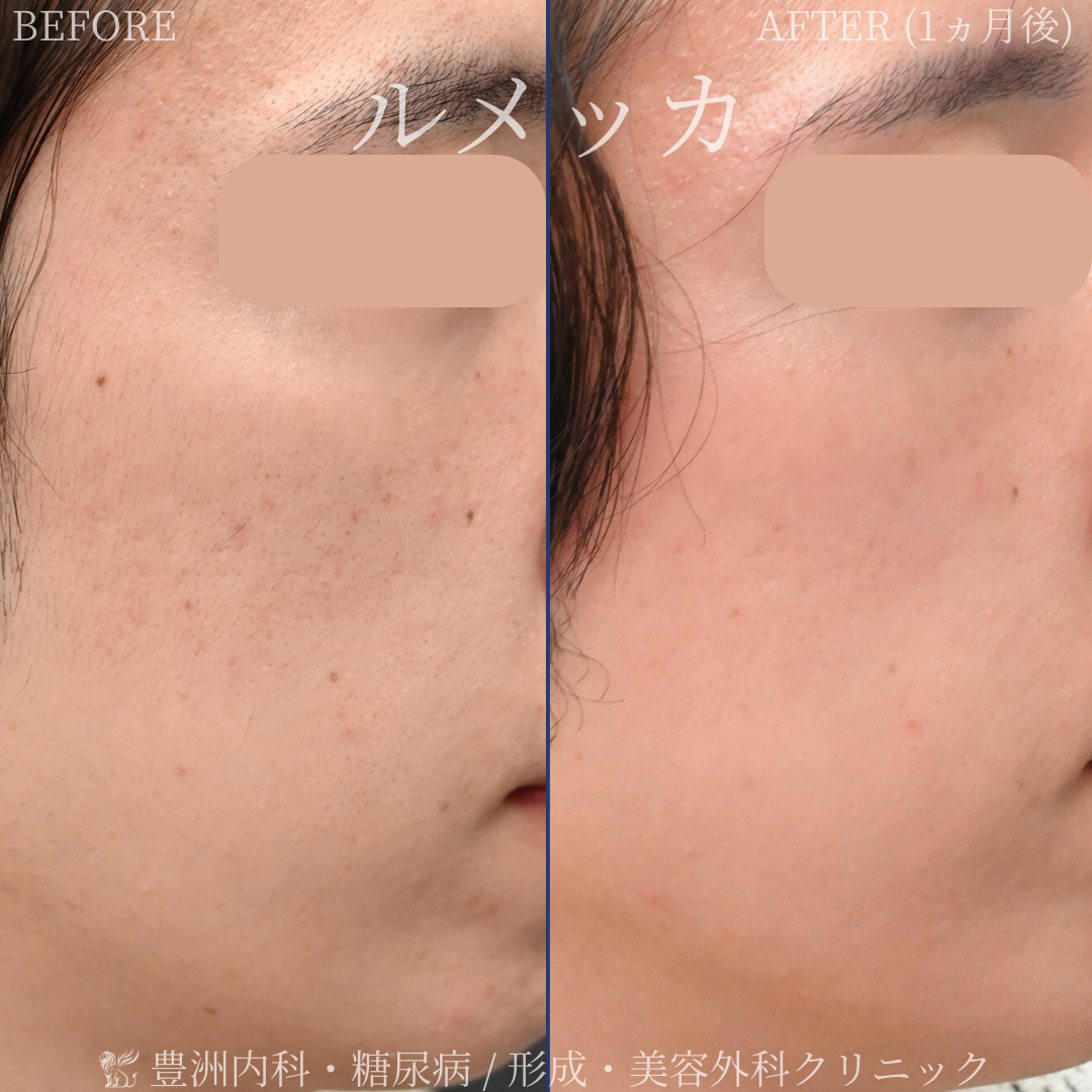 30代男性のルメッカ症例写真です。 シミが薄くなり、毛穴が目立たなくなり、若干の肌の凹凸も改善しております。 肌のキメも細かくなりました。