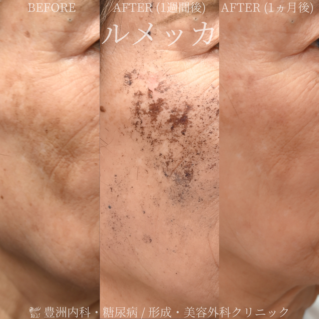 80代女性のルメッカ症例写真です。 1回の施術でかなりシミが薄くなり、肌のトーンアップもされております。
