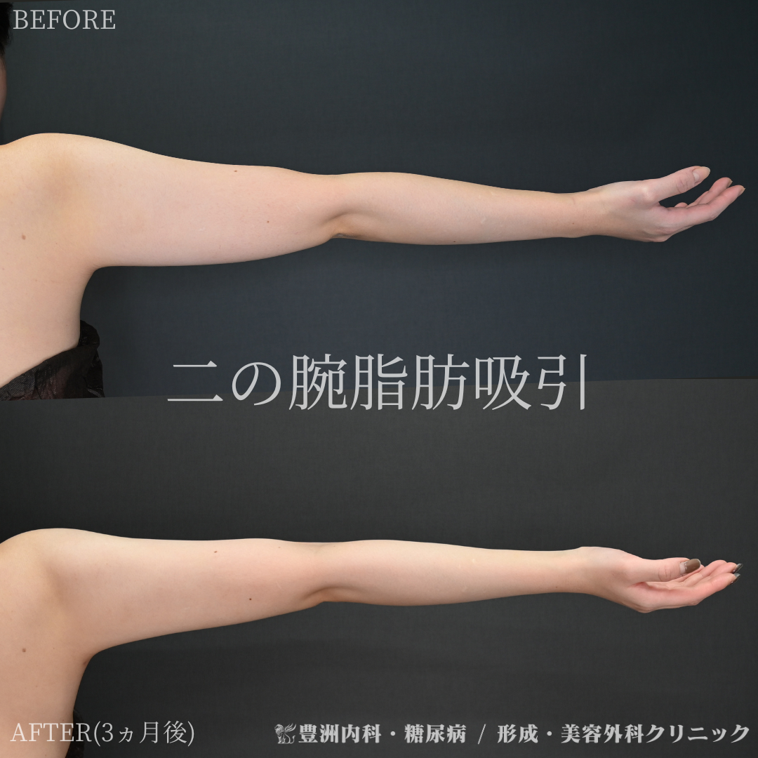本症例では左右250ccずつ脂肪吸引を行っており、ノースリーブを着た時も気にならない二の腕になっております。
