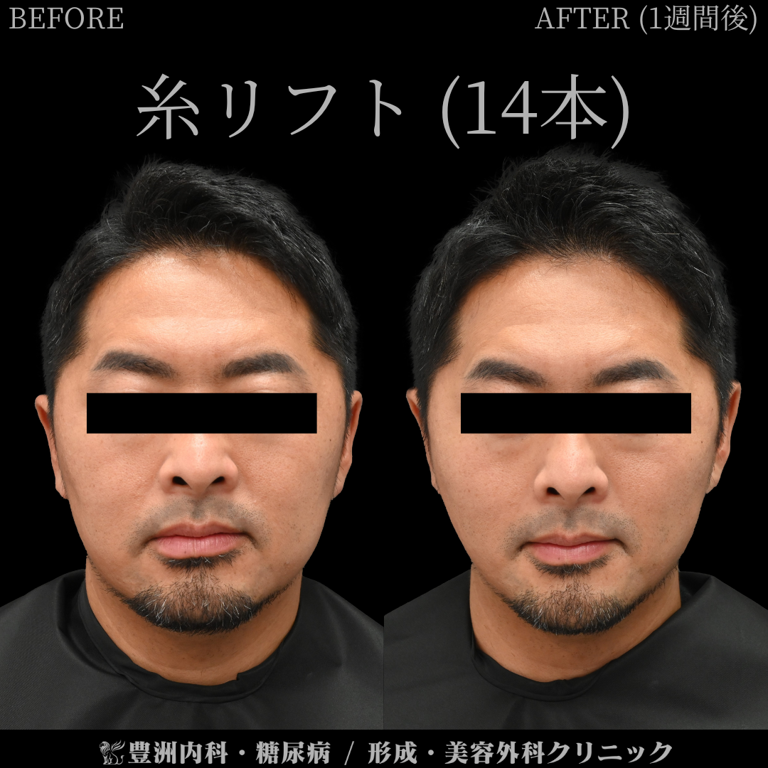 30代男性、糸リフトの施術前後(施術1週間後)の写真です。局所麻酔下で行いました。