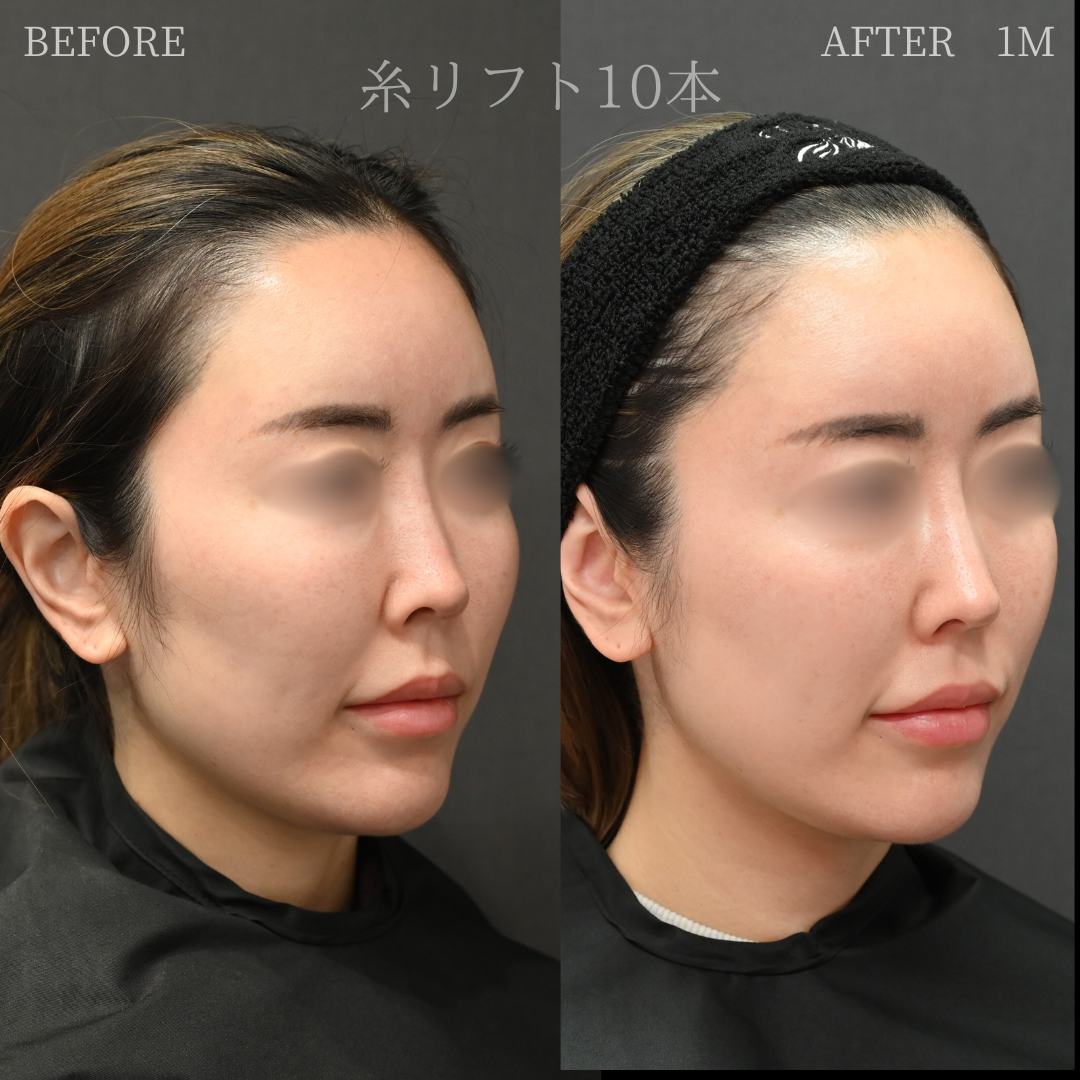 溶ける糸(PDO、PCLLA)を用いたリフトアップの施術になります。当症例ではPDOを10本使用しております。