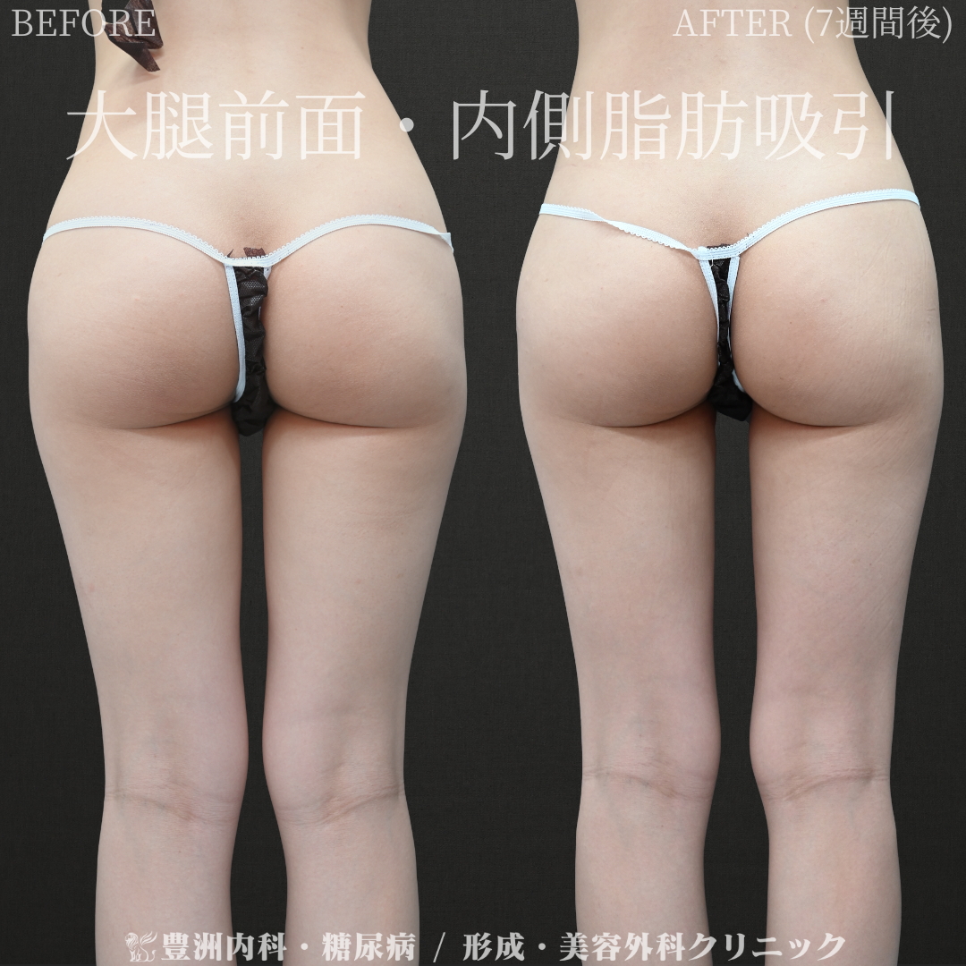 太ももの脂肪吸引の症例です。 傷跡は分かりにくい場所(お尻と太ももの境目、鼠径部)に約5mmの傷をつけて脂肪吸引しています。