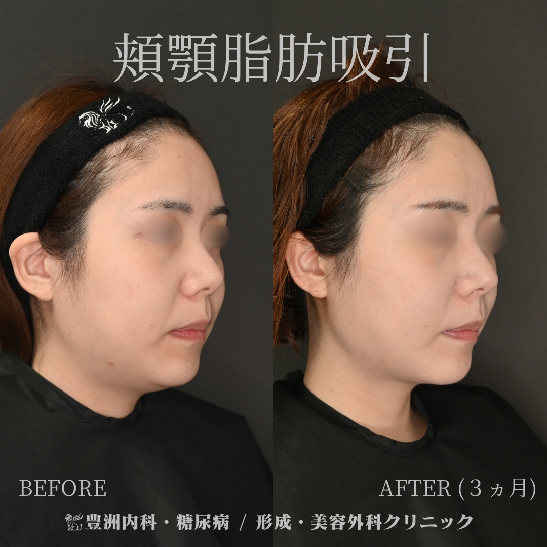 耳下2箇所と顎下の合計3箇所に約3mmの傷をつけて脂肪吸引しました。 頬はこけすぎないように、顎下は皮一枚まで吸引しています。